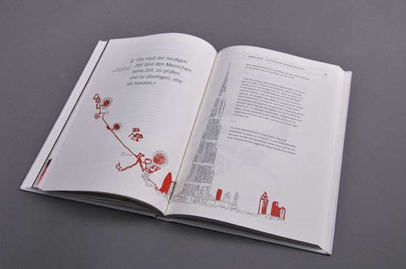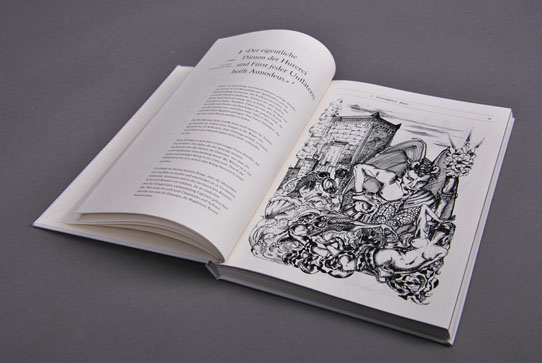 Die Illustrationen passen sich entstprechend den Kapiteln, der geschichtlichen Entwicklung an und werden vom imitierten Kuperstich zur freien Vektorgrafik. Zusätzlich wird der Schritt in die Moderne mit einer Umgewichtung der verwendeten Schriften unterstichen.